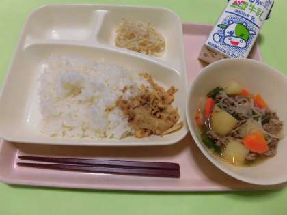 ・肉じゃが ・もやしのゆずの香あえ ・ごまかかいため ・ごはん ・牛乳 です。