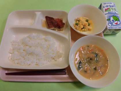・あかうおのしょうゆだれかけ ・みそ汁 ・えんどうの卵とじ ・ごはん ・牛乳 です。