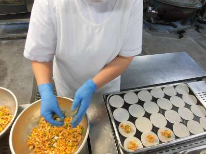 ぎょうざの皮に、ツナ、コーン、ピーマン、ピザソース、チーズを混ぜ合わせた具をのせ、焼き物機で焼いています。