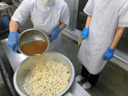 焼き物機で蒸した白玉だんごを、くっつかないように甘さ控えめのたれでからめています。お皿できな粉をかけて食べてくださいね。