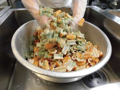 給食では、ちくわにあおのりを混ぜた衣をつけて、油で揚げています。あおのりの香りがとても良いですね。