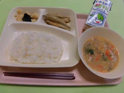 ・きびなごてんぷら ・豚汁 ・わかたけ煮 ・ごはん ・牛乳 です。