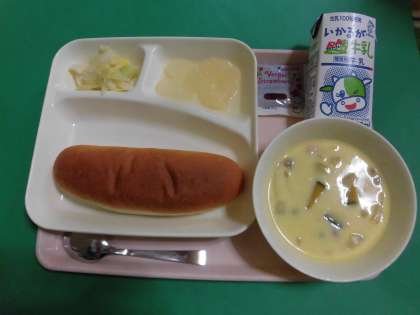 ・かぼちゃのクリームシチュー ・キャベツのゆずドレッシング ・和なし(カット缶) ・コッペパン ・いちごジャム ・牛乳 です。