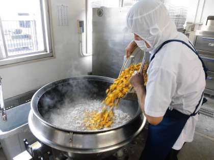 炒めた具材を、クラスごとにミニバットに入れて、パン粉をふって、焼き物機で焼いています。旬のかぼちゃの甘みとひき肉の旨みがとてもよく合う、ケチャップ味のグラタンです。今日は、粉末チーズを使っていないので、乳アレルギーのある人も、食べることができます。