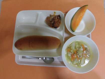 ・かぼちゃのミートグラタン ・鶏肉と野菜のスープ ・クインシーメロン ・黒糖パン ・牛乳 です。