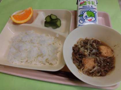 ・すき焼き煮 ・きゅうりのしょうがづけ ・オレンジ ・ごはん ・牛乳 です。