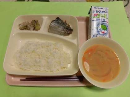 ・さごしのつけ焼き ・みそ汁 ・キャベツの赤じそあえ ・ごはん ・牛乳 です。