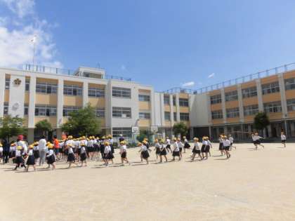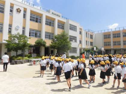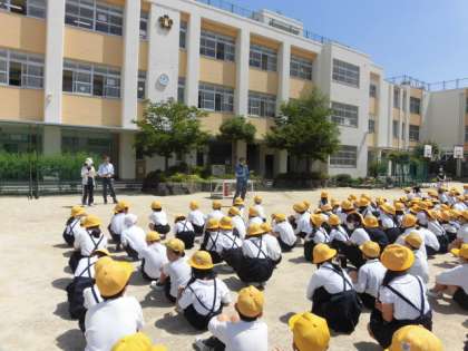 緊急地震速報が発令され、まず身の安全を守る。和歌山県沖で震度6強の地震が発生し、関西地方でも大きな揺れが起き、さらに余震があり校舎外に避難する。また、避難後津波の恐れがあるので、高いところ(校舎の3階)に避難する。このような想定の下、避難訓練を実施しました。昨日の大雨のこともあり、子どもたちは、真剣に取り組みました。教室から運動場へは、3分以内で避難することができました。
