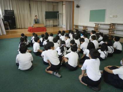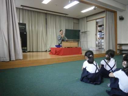 落語では、扇子や手ぬぐいを使って本やお箸に見立てたり、身振りや話し方、表情や目線によって登場人物を何人も表したりするなど、落語特有の表現の仕方を教えていただきました。児童は、とても興味をもって、食い入るようにお話を聞いていました。