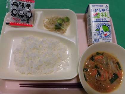 ・マーボーはるさめ ・チンゲンサイともやしの甘酢あえ ・いり黒豆 ・ごはん ・牛乳  です。