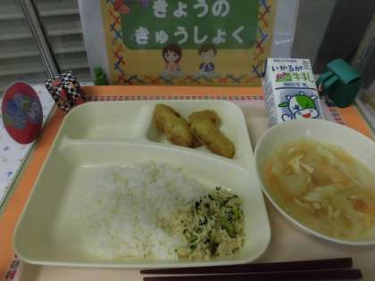・白身魚フリッター ・すまし汁 ・とりなっ葉いため ・ごはん ・牛乳  です。