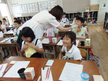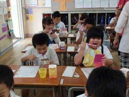 2年生の子どもたちは教室で歯みがきをしたあと、歯垢染め出しをしてもらい、普段の磨き方でみがき残しがあるかどうかを鏡を使って確かめていました。