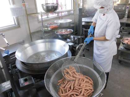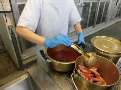 ソーセージは太さによって名前が変わり、2センチメートルより細いものをウインナーソーセージといいます。ゆでたウインナーソーセージに、ケチャップ、トンカツソース、ウスターソースなどで作ったソースをかけています。