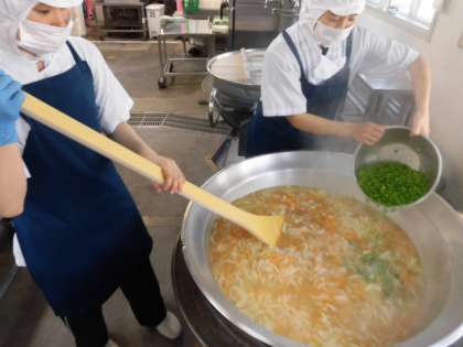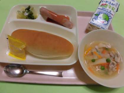 ・ウインナーのケチャップソース ・スープ ・キャベツとさんどまめのサラダ ・コッペパン ・アプリコットジャム ・牛乳 です。