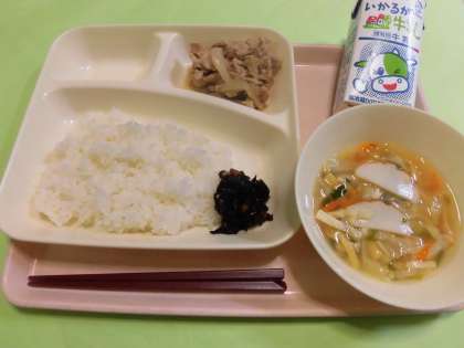 ・豚肉の甘辛焼き ・五目汁 ・のりのつくだ煮 ・ごはん ・牛乳 です。
