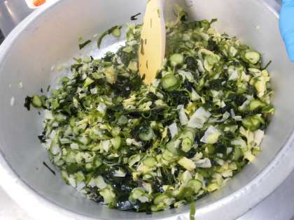 サラダには、ミックス海そうとキャベツ、きゅうりを使っています。さっぱりとした味つけです。