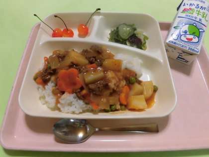 ・ハヤシライス ・ミックス海そうのサラダ ・さくらんぼ ・牛乳 です。