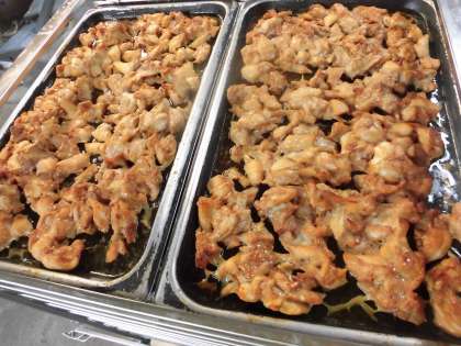 鶏肉に、料理酒、こいくちしょうゆ、バターで味つけをして、焼き物機で焼いています。
