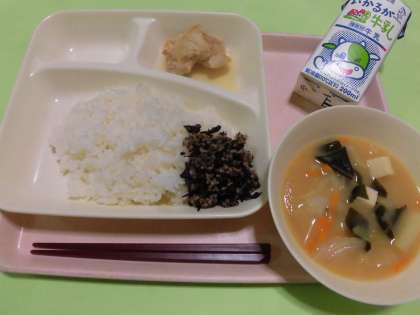 ・鶏肉のおろしじょうゆかけ ・みそ汁 ・魚ひじきそぼろ ・ごはん ・牛乳 です。