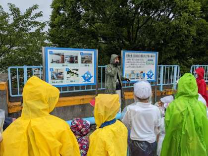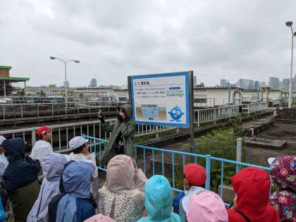 甲子園球場13個分の広さの浄水場を歩いて回り、水がきれいになるまでの話を聞いたり、施設を見たりしています。