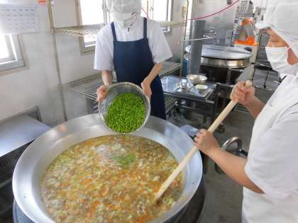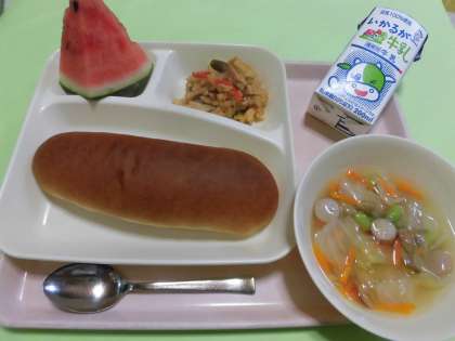 ・パエリア ・ウインナーとキャベツのスープ ・すいか ・黒糖パン ・牛乳 です。