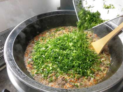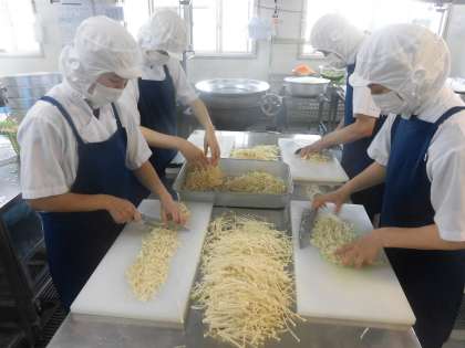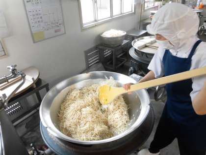 牛肉と糸こんにゃく、たまねぎ、にんじん、えのきたけを甘辛く味つけして煮ています。斜め切りの青ねぎで、彩りを添えています。