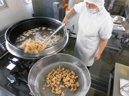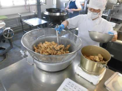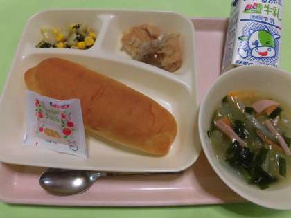 ・鶏肉のからあげ ・とうがんの中華スープ ・ツナとチンゲンサイのいためもの ・コッペパン ・りんごジャム ・牛乳 です。