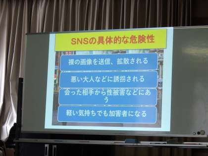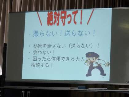 インターネットを通じたトラブルや、いじめ被害、メッセージアプリでのトラブル、生活習慣の崩れからの事件被害などについて、実際の事例を挙げながら教えていただきました.