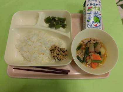 ・豚肉とじゃがいもの煮もの ・オクラの梅風味 ・ツナっ葉いため ・ごはん ・牛乳  です。