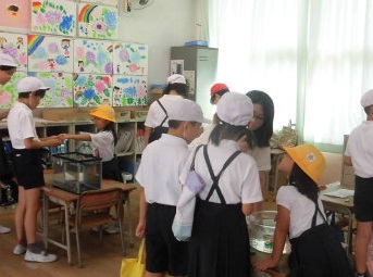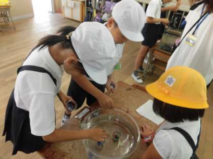 1人5個ずつプルタブをもらいます。それぞれの場所に分かれて、プルトップを水槽の中の落とし、入れ物に入れます。制限時間内に何個入ったかを数えます。