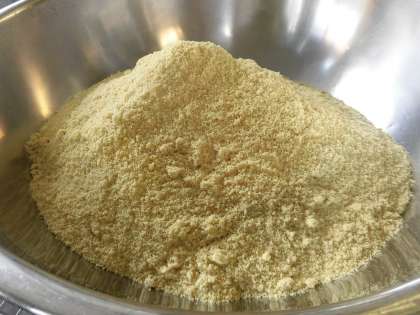 高野どうふは、鎌倉時代の終わりごろから食べられている伝統的な食べ物です。うすく切ったとうふを凍らせて、乾燥させて作ります。今日は、高野どうふを粉状にしたものを使っています。