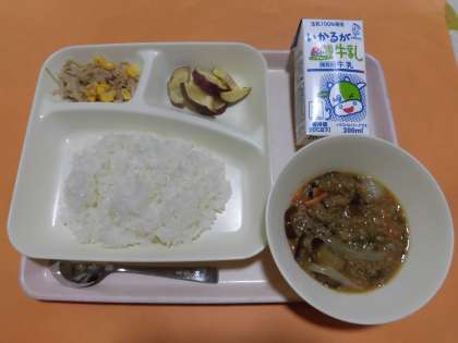 ・マーボーなす ・ツナと野菜のいためもの ・焼きさつまいもの甘みつかけ ・ごはん ・牛乳 です。