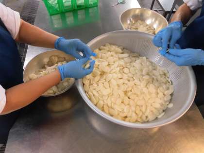 「トック」には、韓国・朝鮮のもちを使っています。日本のもちはもち米から作りますが、韓国・朝鮮のもちはうるち米から作ります。もちがくっつかないように、ひとつひとつ外してから入れてくださっていました。