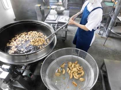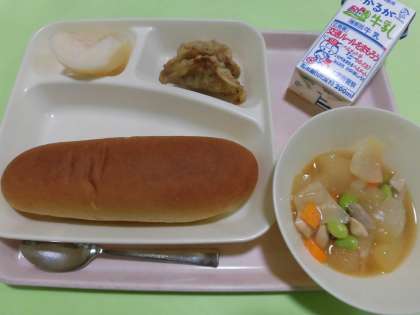 ・あげぎょうざ ・鶏肉ととうがんの中華煮 ・なし(二十世紀) ・黒糖パン ・牛乳 です。