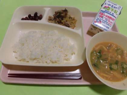 ・豚肉の甘辛焼き ・とうがんのみそ汁 ・金時豆の煮もの ・ごはん ・牛乳  です。