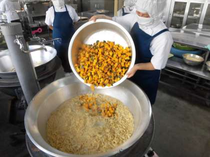 日本でよく食べられているのは、西洋かぼちゃという種類で、いろいろな料理に使われています。今日は、北海道産のかぼちゃをみそ汁に使っています。