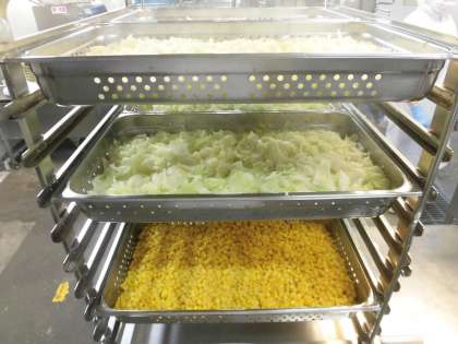 ・チキンカレーライス[米粉] ・キャベツとコーンのサラダ ・白桃(カット缶) ・牛乳  です。