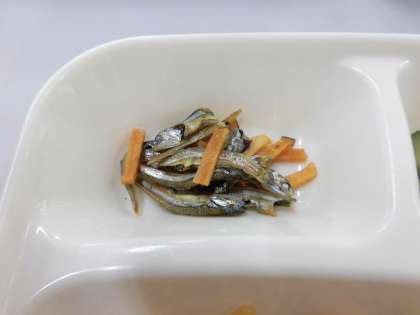 かたくちいわしとさつまいもを使っています。歯ごたえがあるので、よくかんで食べましょう。