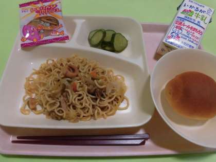 ・焼きそば ・きゅうりのしょうがづけ ・いもけんぴフィッシュ ・1/2パン ・牛乳  です。