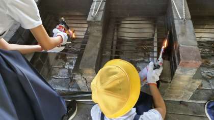 焼き板作りは、ガスバーナを使って自分で木の板を焼きます。その後、軍手に炭がつかなくなるまで、板をたわしでこすります。最後に、焼き板に絵を描いて完成です。みんな個性あふれる焼き板ができあがりました。