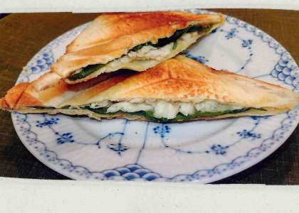 マヨネーズを塗った食パンに、ほぐしたサラダチキン、梅干し、しそ、チーズをはさんだホットサンドです。