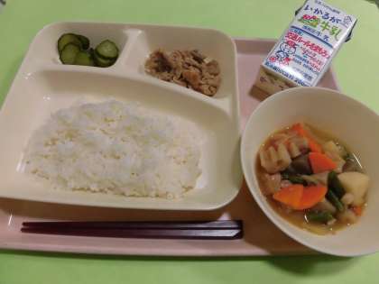 ・豚肉のねぎじょうゆ焼き ・ふきよせ煮 ・きゅうりの甘酢づけ ・ごはん ・牛乳 です。