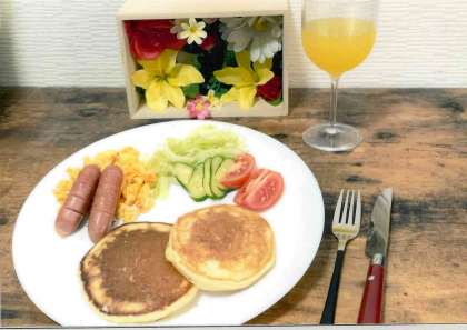 ホットケーキとサラダ、ウインナー、卵と3色そろった最高の朝ごはんです。