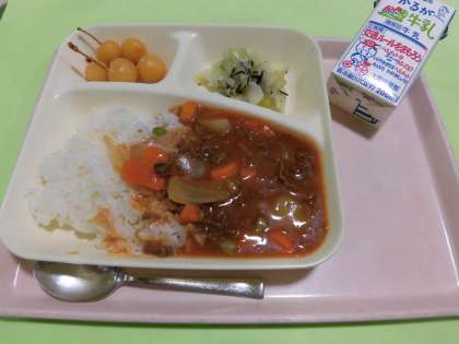 ・ハヤシライス[米粉] ・キャベツのひじきドレッシング ・さくらんぼ(缶) ・牛乳  です。