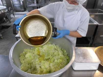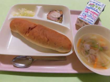 ・かつおのガーリックマリネ焼き[ノンエッグドレッシング] ・ウインナーとじゃがいものスープ ・キャベツのサラダ ・レーズンパン ・牛乳 です。