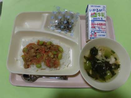 ・ピリ辛丼 ・中華スープ ・ミニフィッシュ ・牛乳  です。