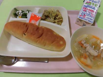 ・豚肉のカレー風味焼き ・鶏肉と野菜のスープ ・さんどまめとコーンのサラダ[ノンエッグドレッシング] ・おさつパン ・牛乳 です。