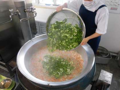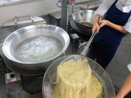 豚骨スープを使って、チンゲンサイ、もやし、にんじんが入った汁めんに、肉みそをのせて食べます。