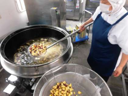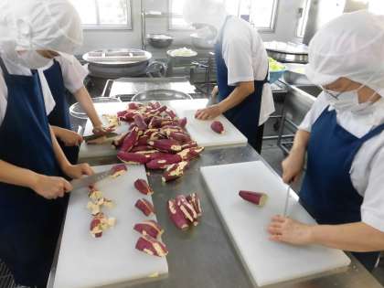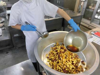 今日は、油で揚げたさつまいもに、砂糖、塩、こいくちしょうゆで作ったたれをからませています。