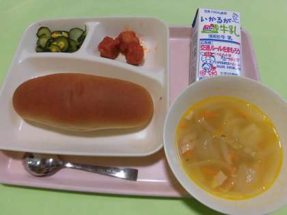 ・まぐろのオーロラ煮 ・スープ ・きゅうりとコーンのサラダ ・黒糖パン ・牛乳  です。